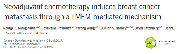 A summary of the study reports that “the authors discovered that several types of chemotherapy can increase the amounts of TMEM complexes and circulating tumor cells in the bloodstream.” It concludes that “chemotherapy, despite decreasing tumor size, increases the risk of metastatic dissemination.”