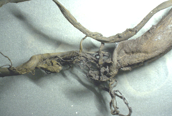 Crystal-like structures are attached to the bark-like structure of the blood clot. Remember, this clot is stained using a violet stain, which accounts for its dark purple color.