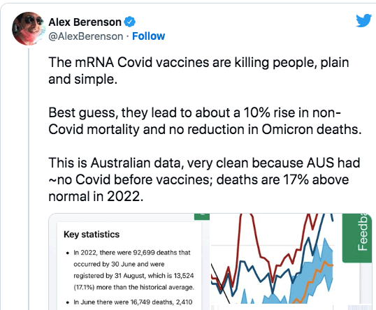 “This is Australian data, very clean because AUS had ~no Covid before vaccines; deaths are 17% above normal in 2022.” (Related: In 2021, Berenson was banned from Twitter for quoting the results of a Pfizer clinical trial that reflect badly on the injections.)